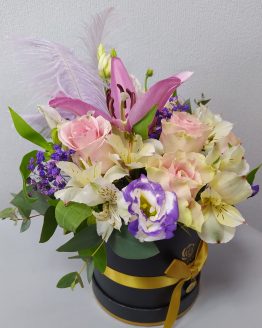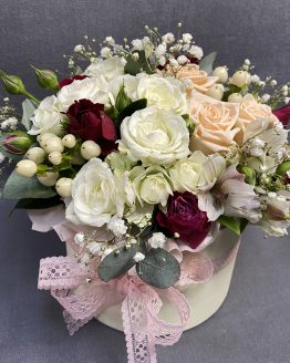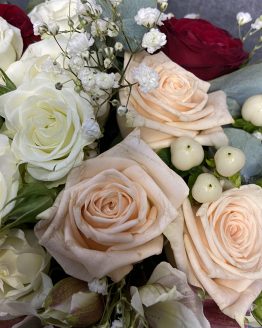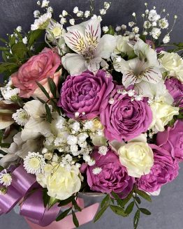 Композиция из роз, альстромерий и гипсофилы