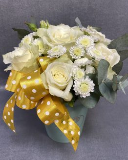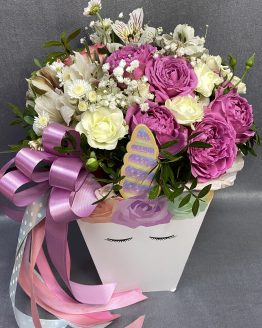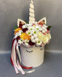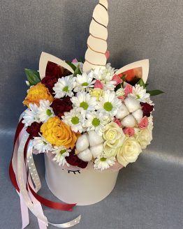 Композиция «Единорог» из роз, хризантем и хлопка