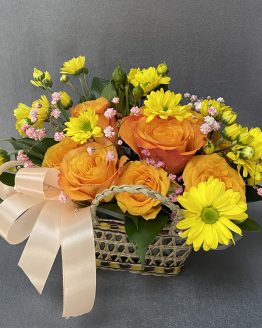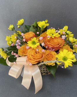 Композиция из роз, хризантем и гипсофилы