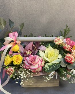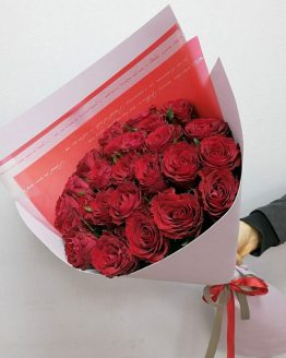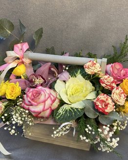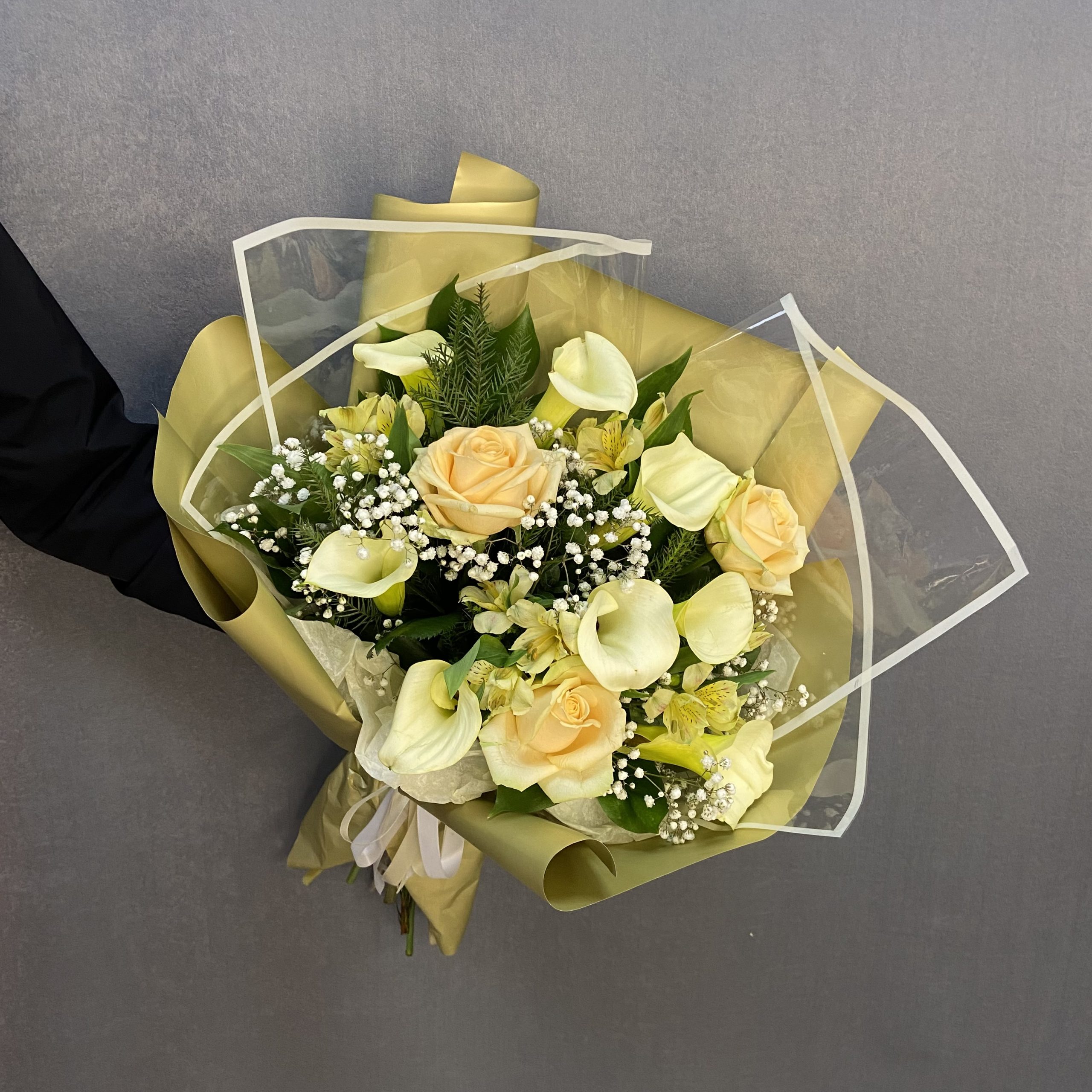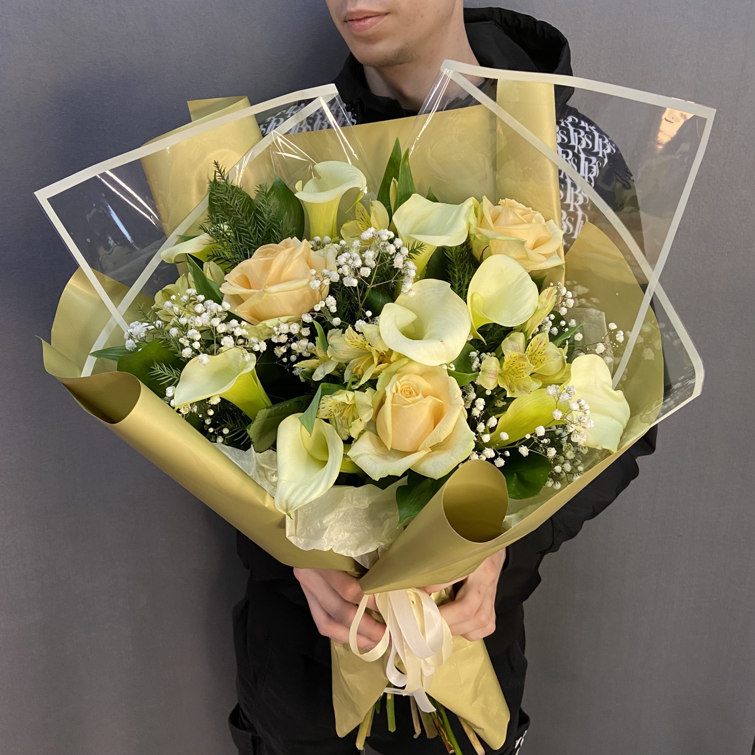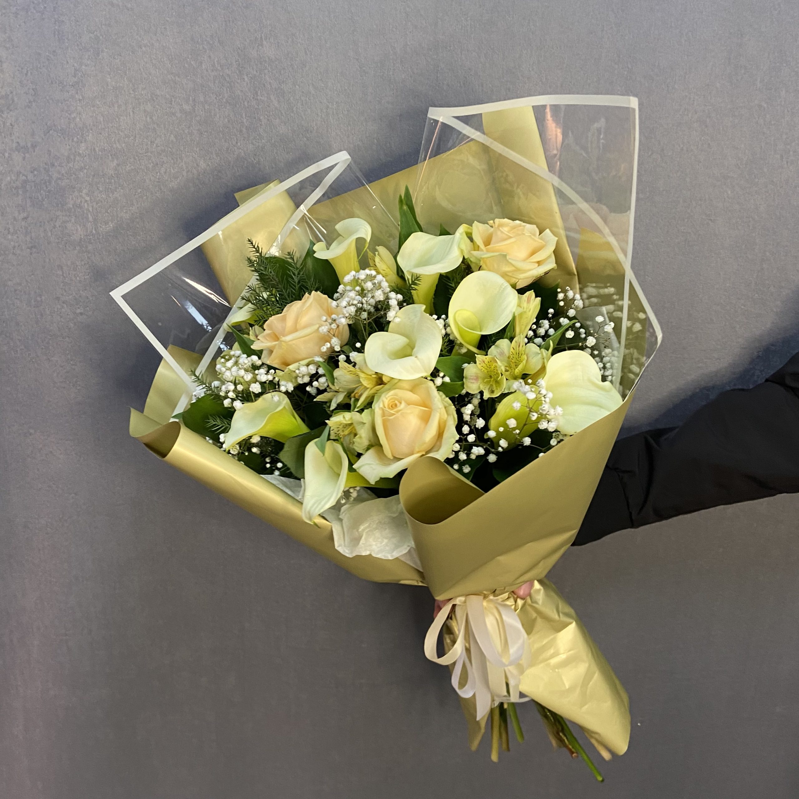 Состав: калла — 9,альстромерия — 5,Роза 60 — 3,тропический микс — 1,гипсофила — 1,матовая пленка — 4,лента атласная — 1