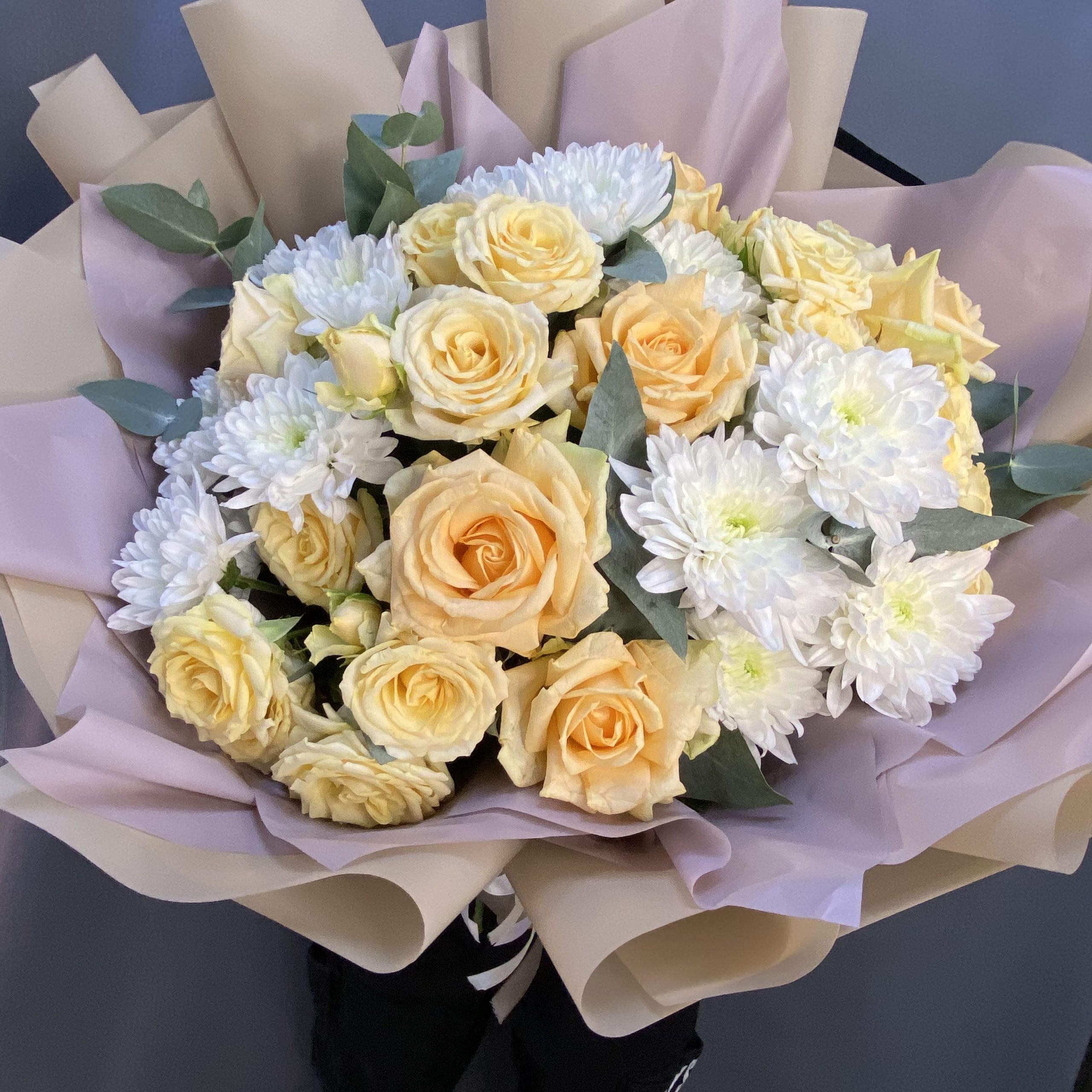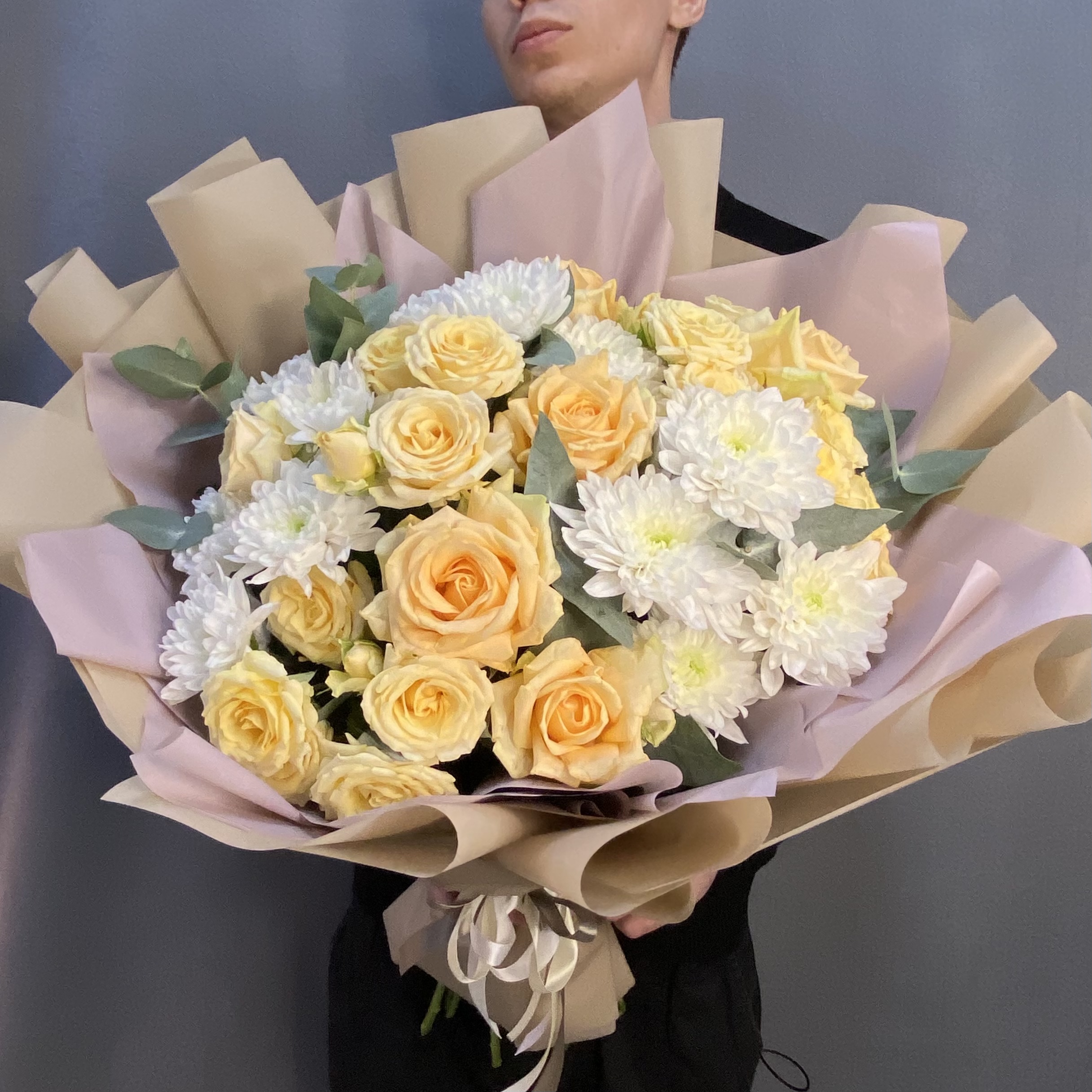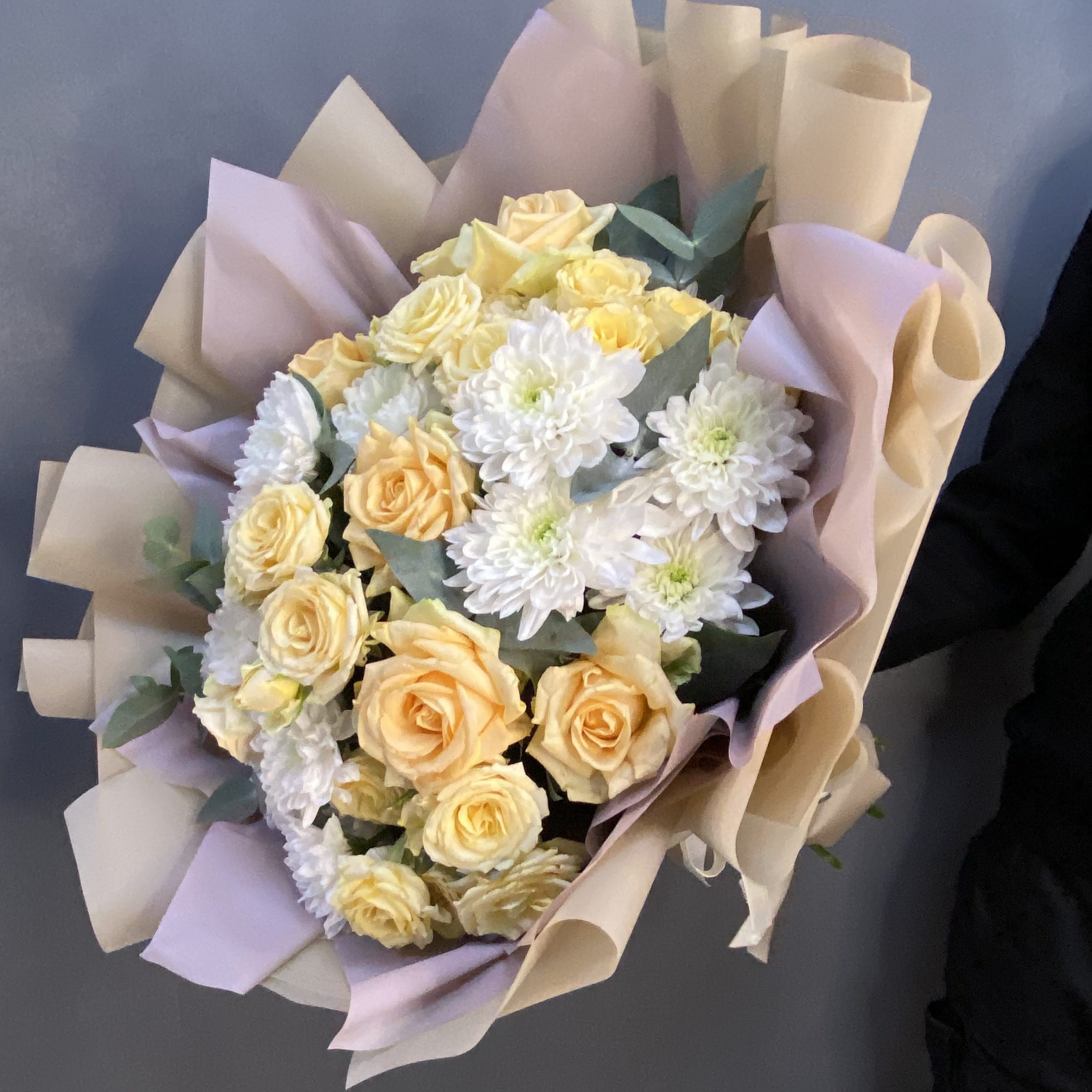 Состав: хризантема кустовая — 5,Роза 60 — 5,роза кустовая — 5,тропический микс — 1,матовая пленка — 6,лента атласная — 1