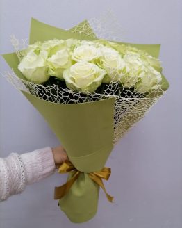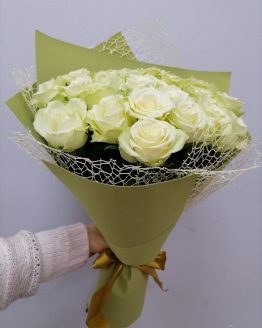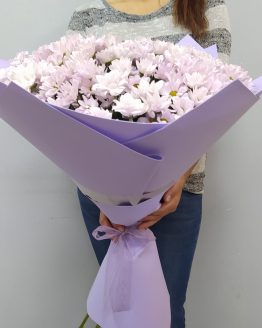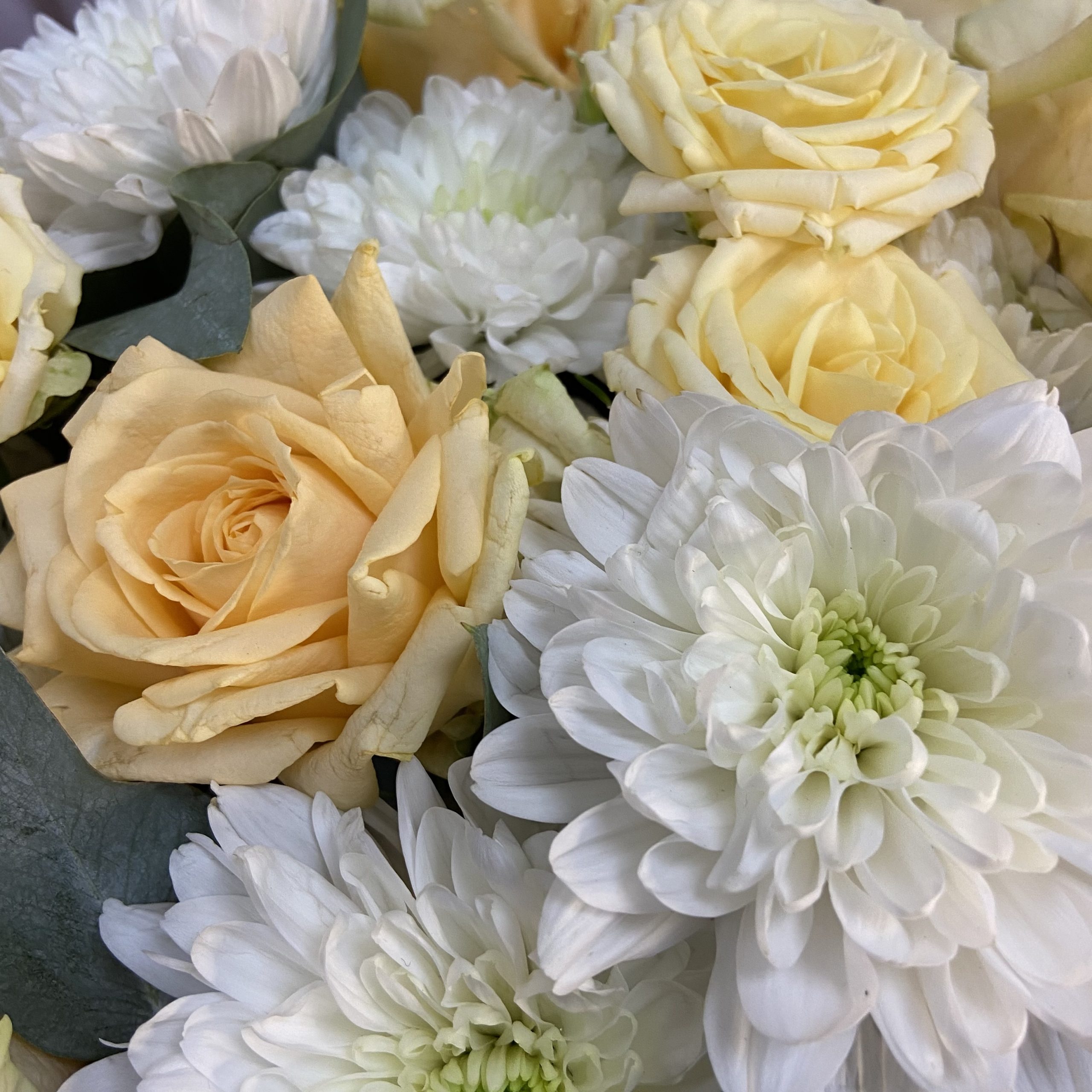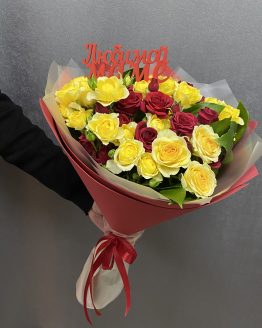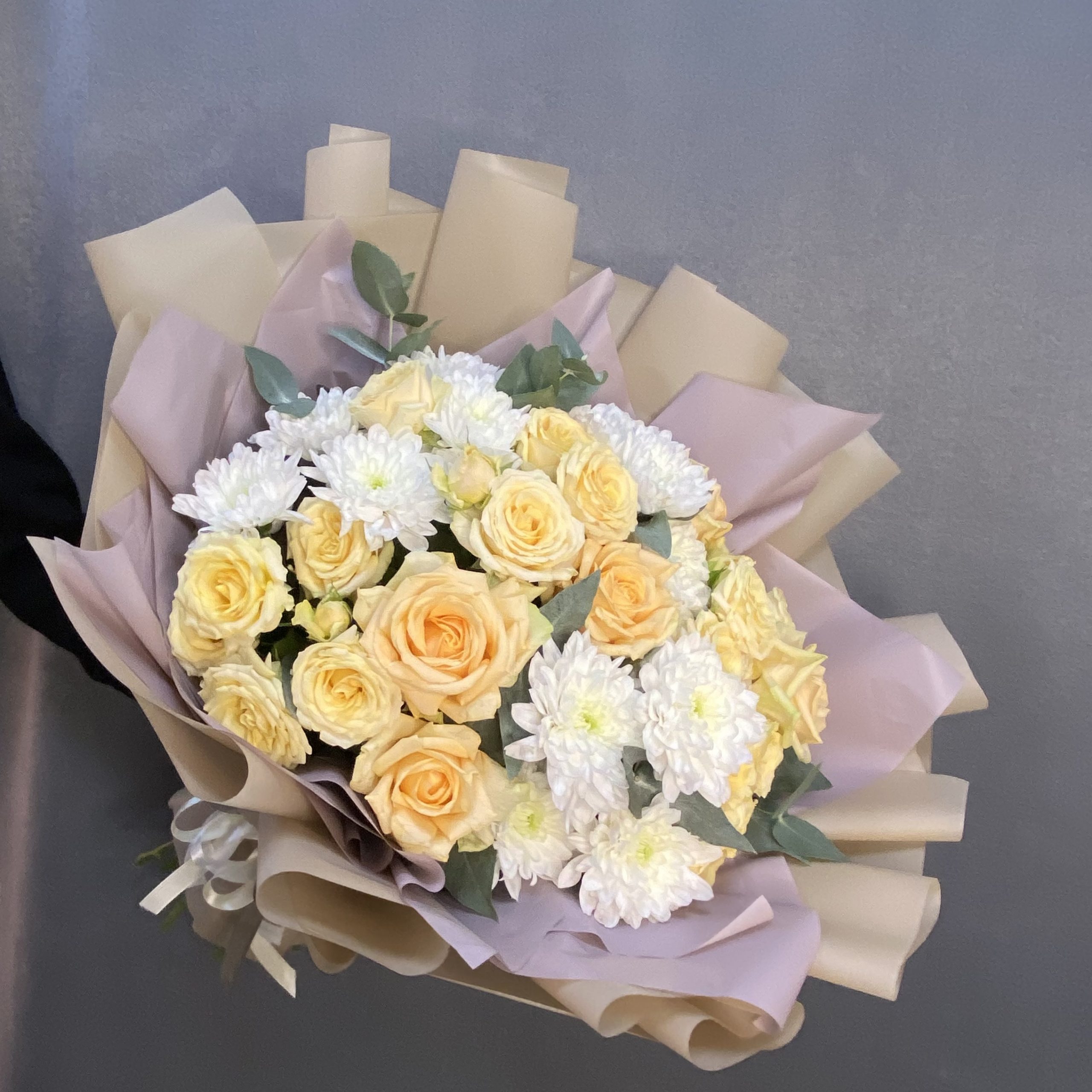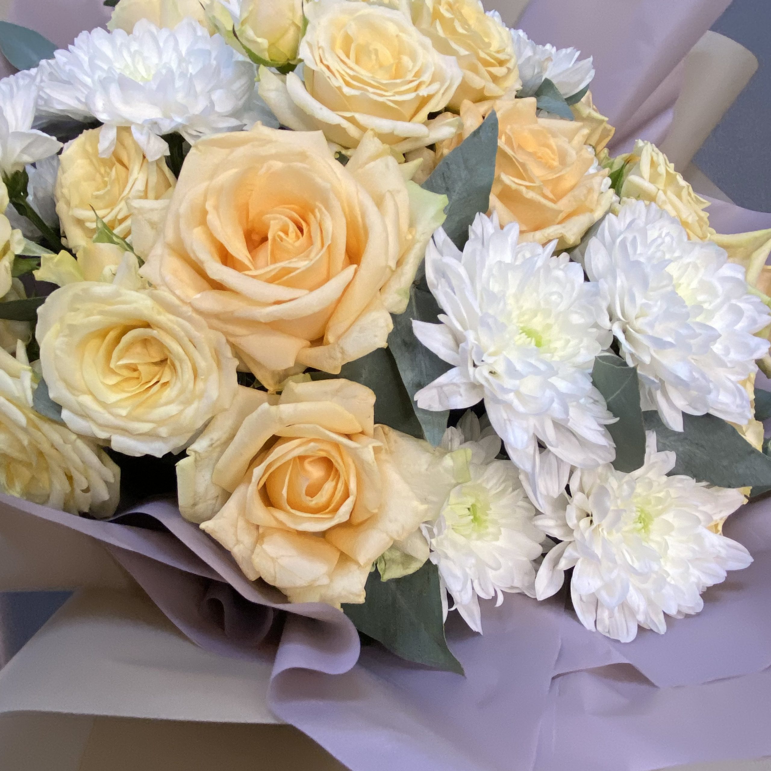 Состав: хризантема кустовая — 5,Роза 60 — 5,роза кустовая — 5,тропический микс — 1,матовая пленка — 6,лента атласная — 1