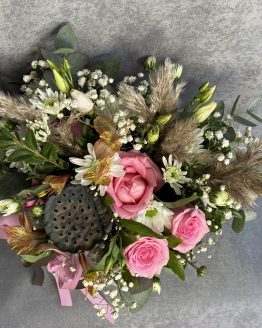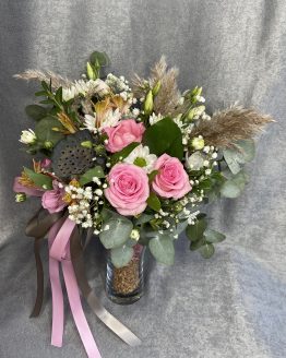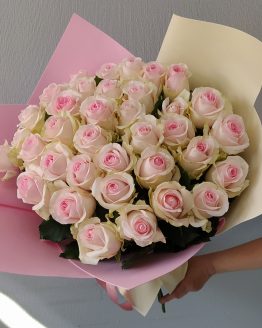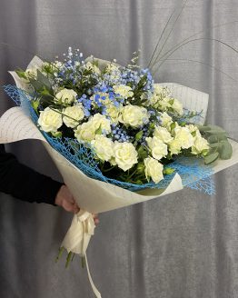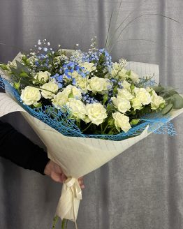 Состав: роза кустовая — 6,Роза 50 — 5,гортензия — 1,гипсофила — 1,матовая пленка — 1,тишью — 1,лента атласная — 1
