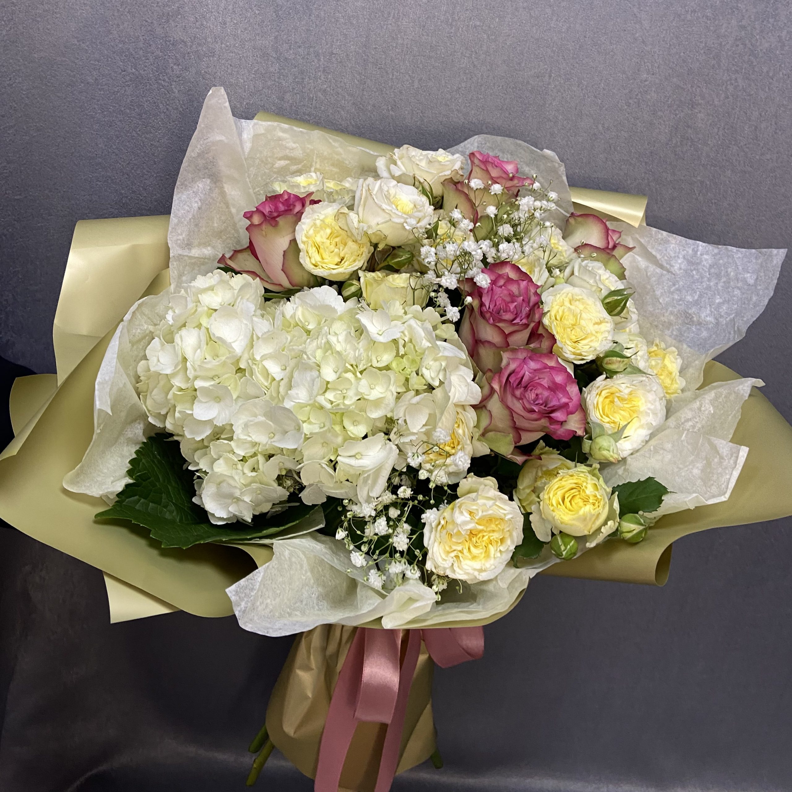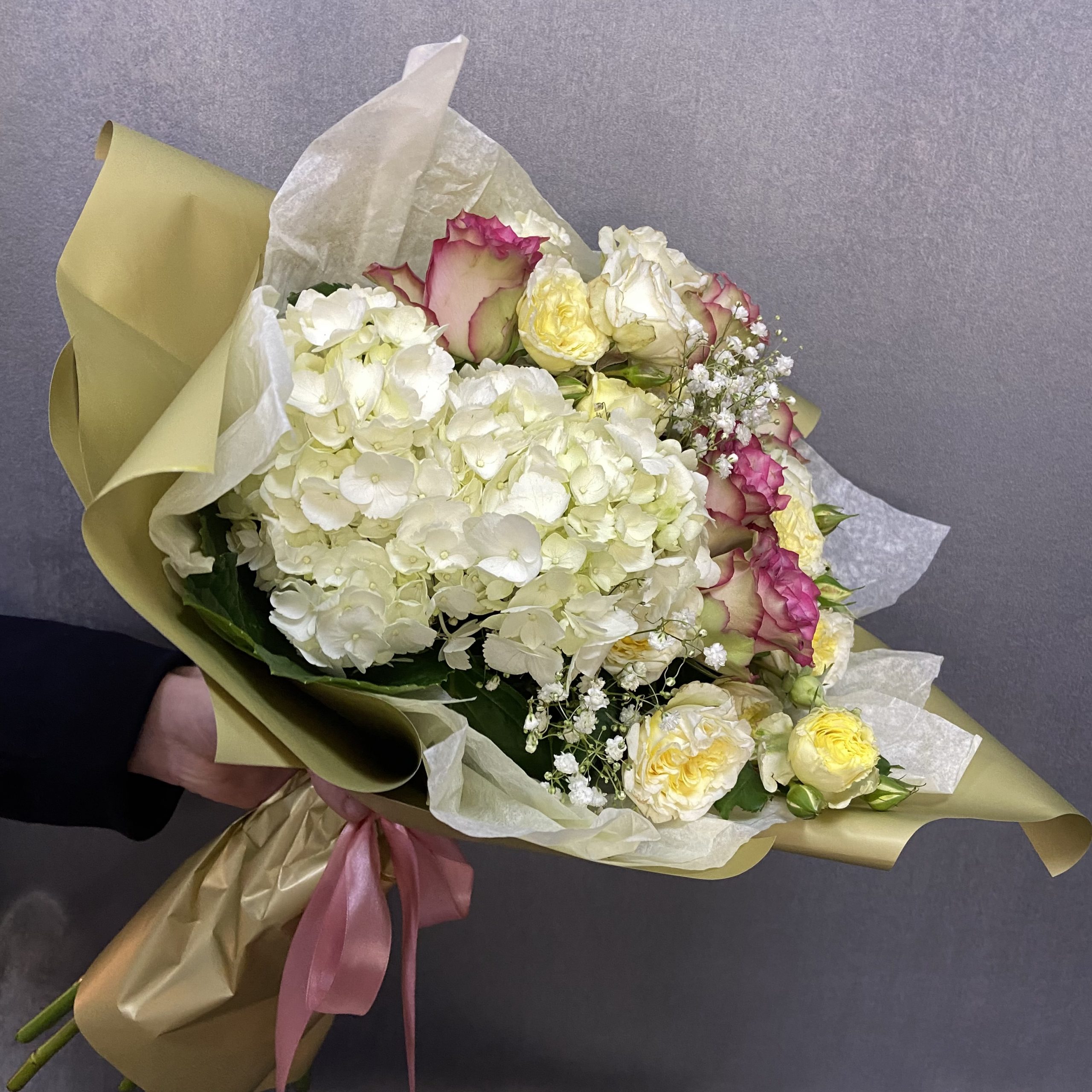 Букет из роз, гортензии и гипсофилы