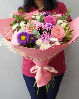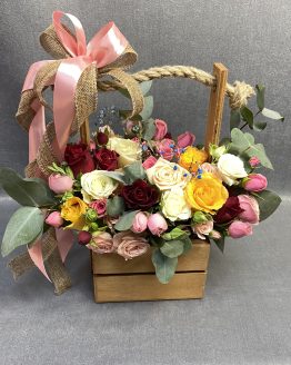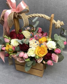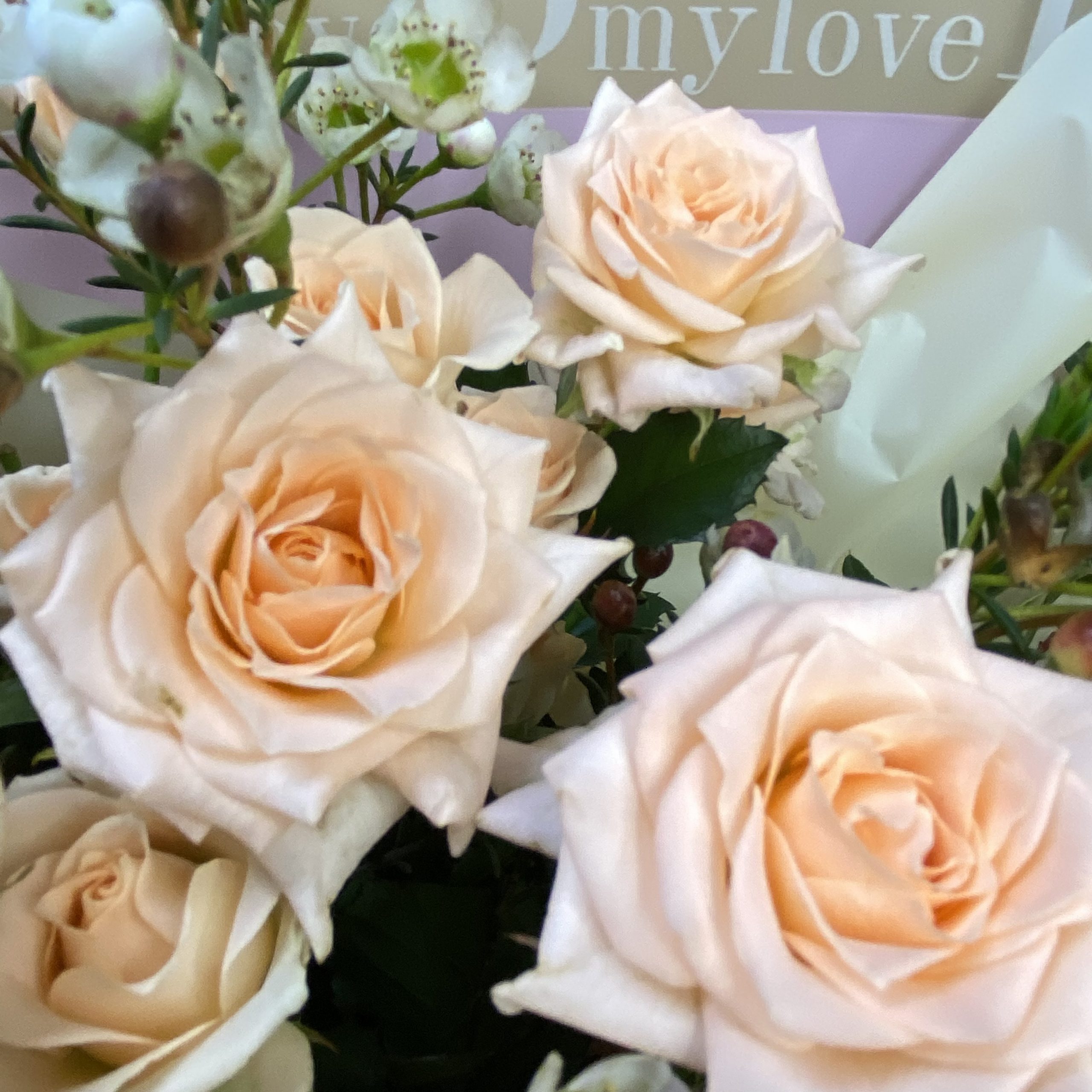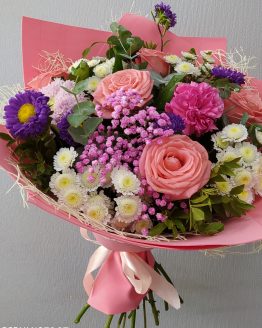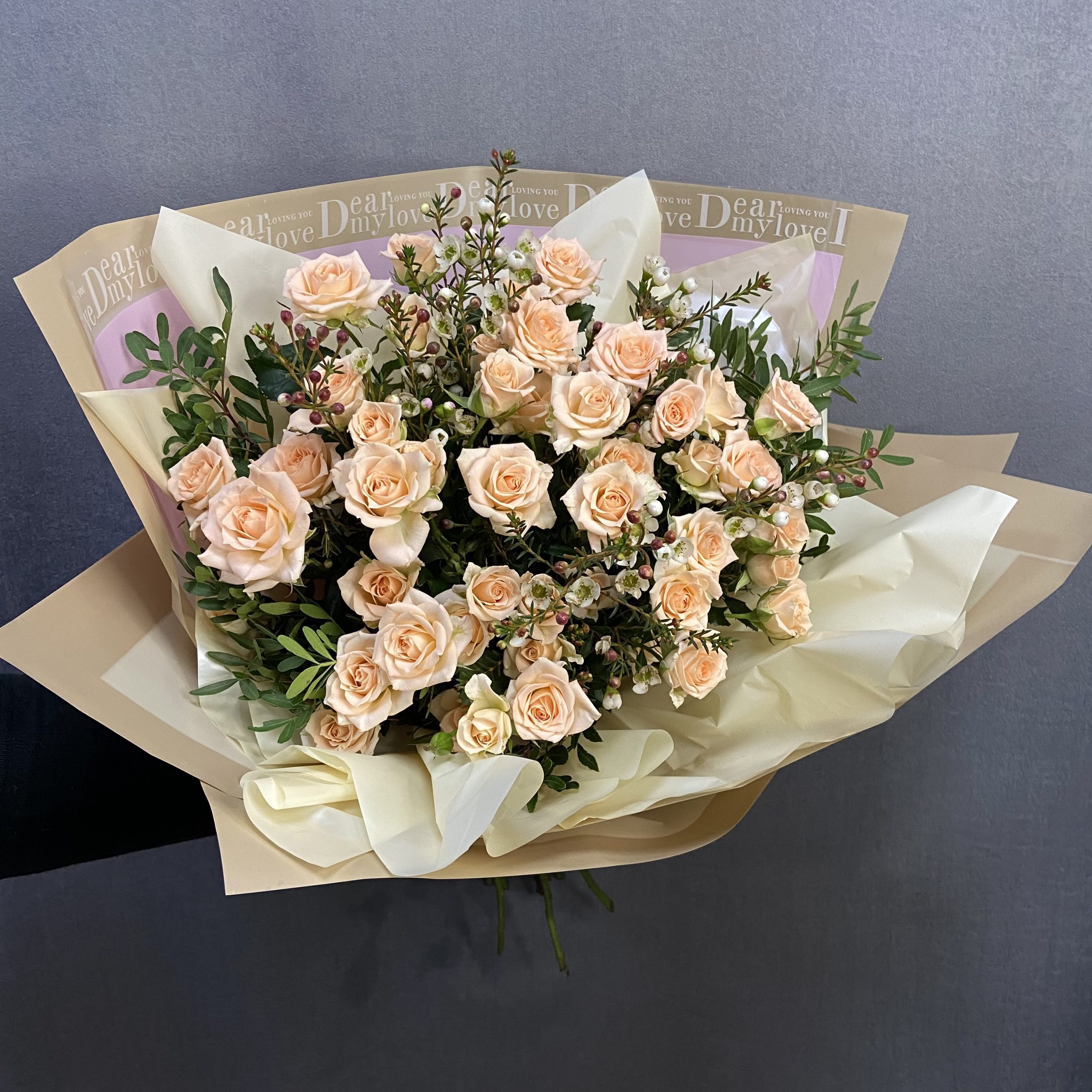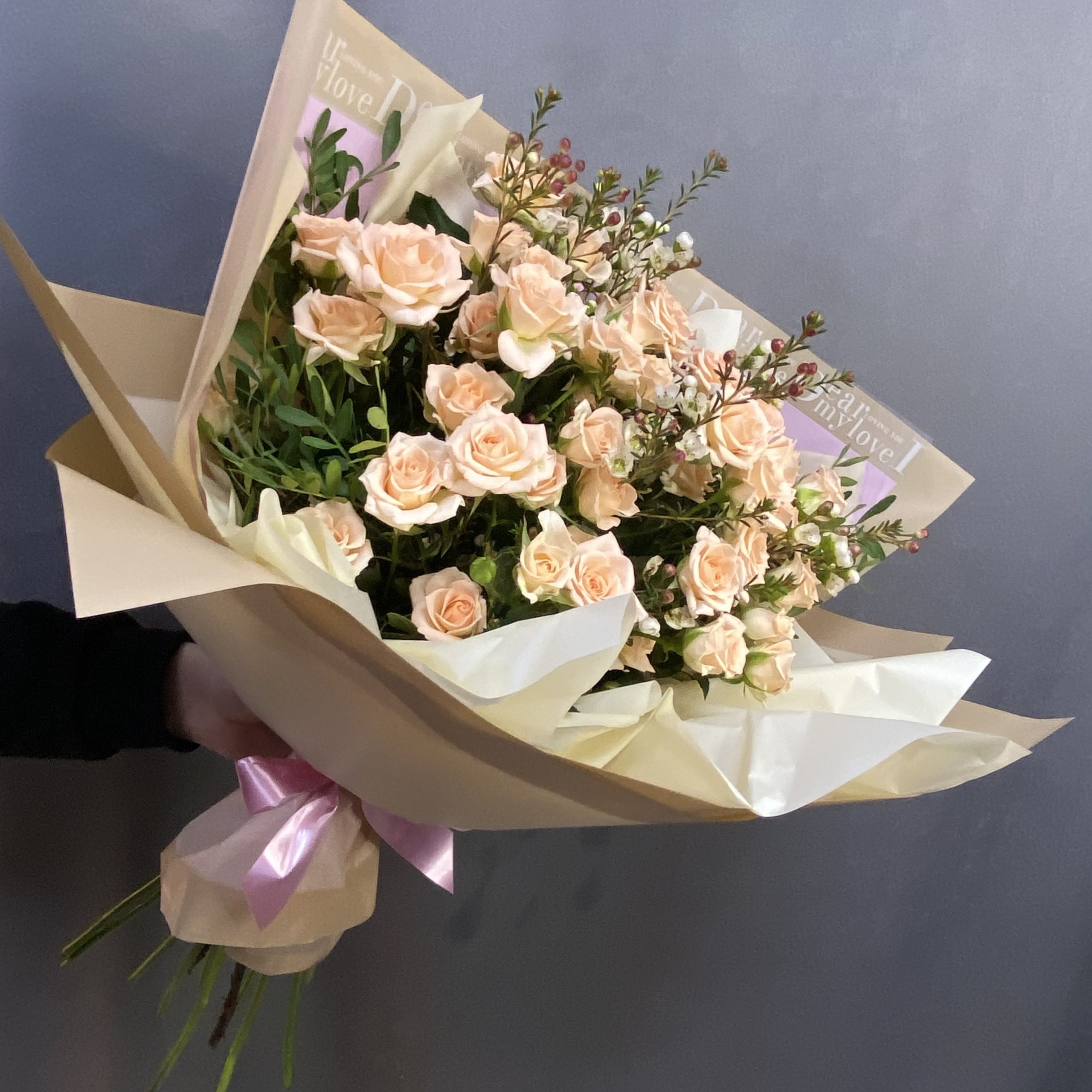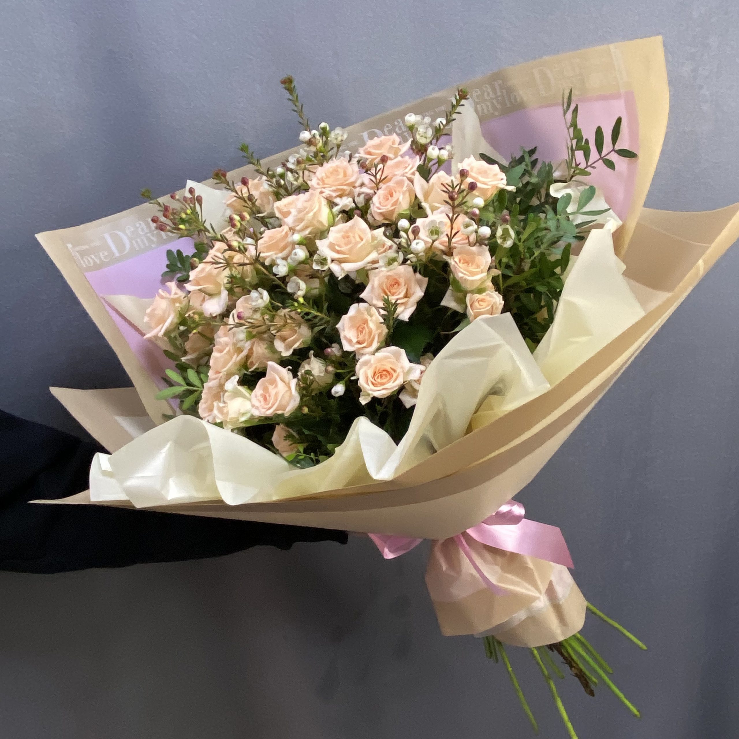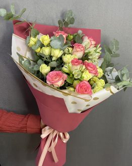Состав: роза кустовая — 11,хамелацуим — 2,тропический микс — 1,матовая пленка — 2,тишью — 2,лента атласная — 1