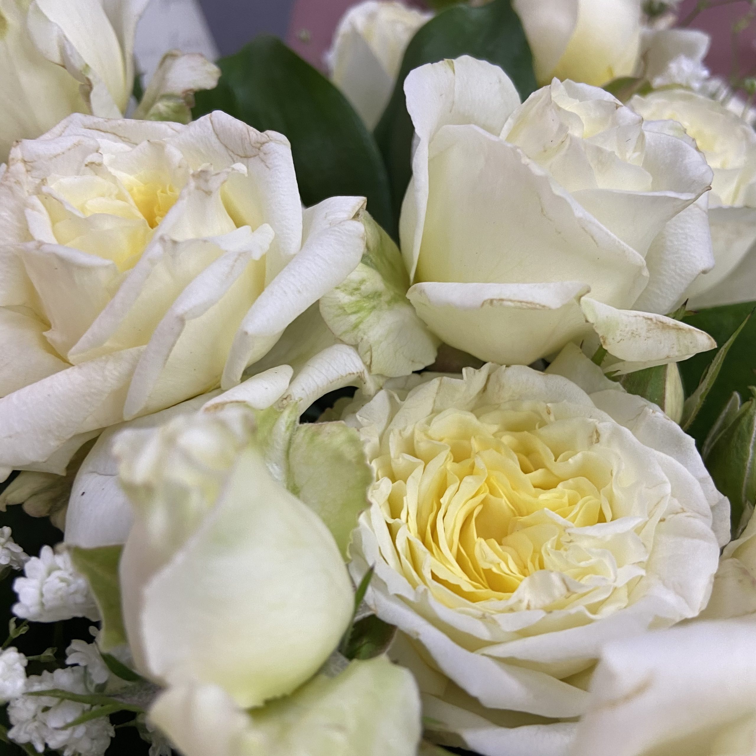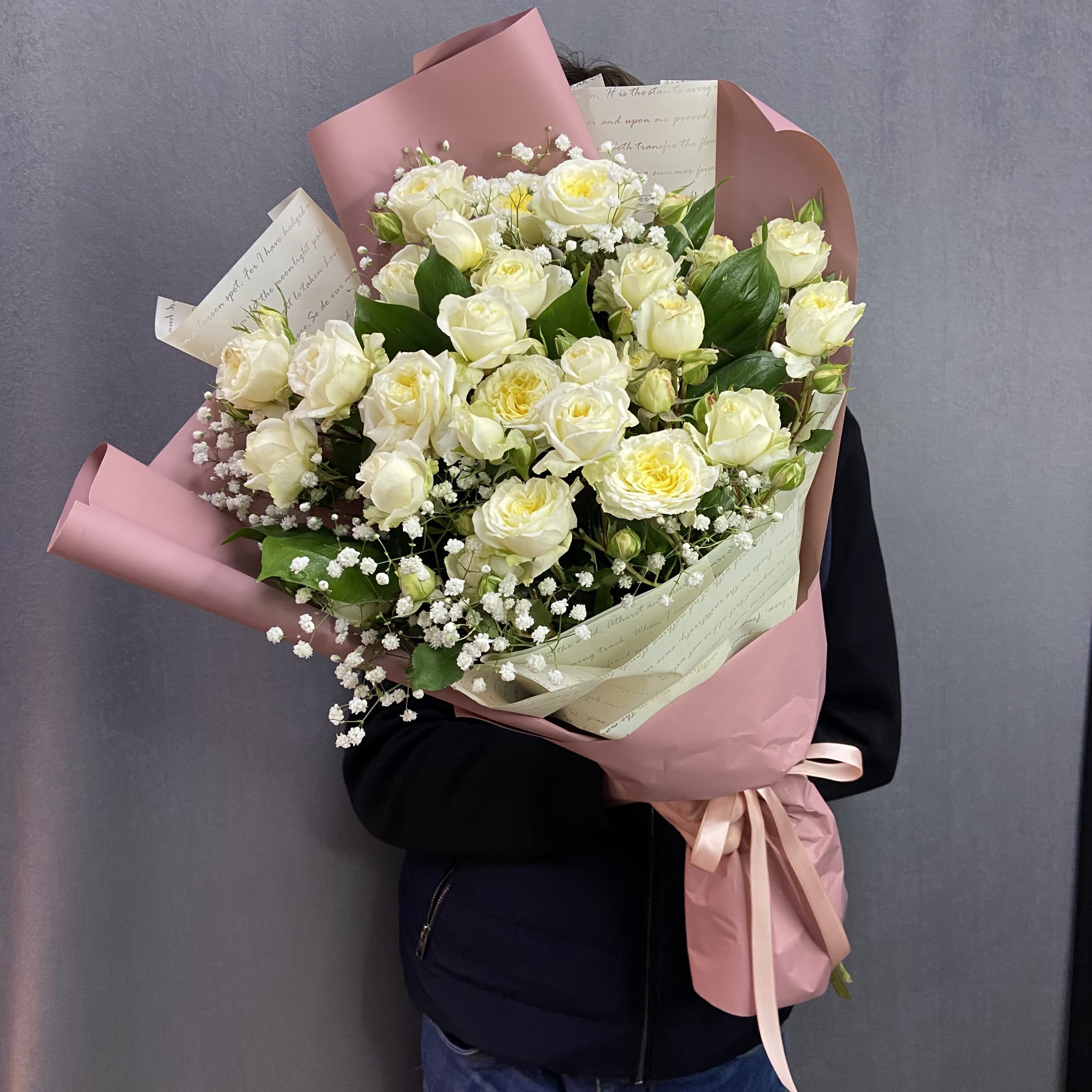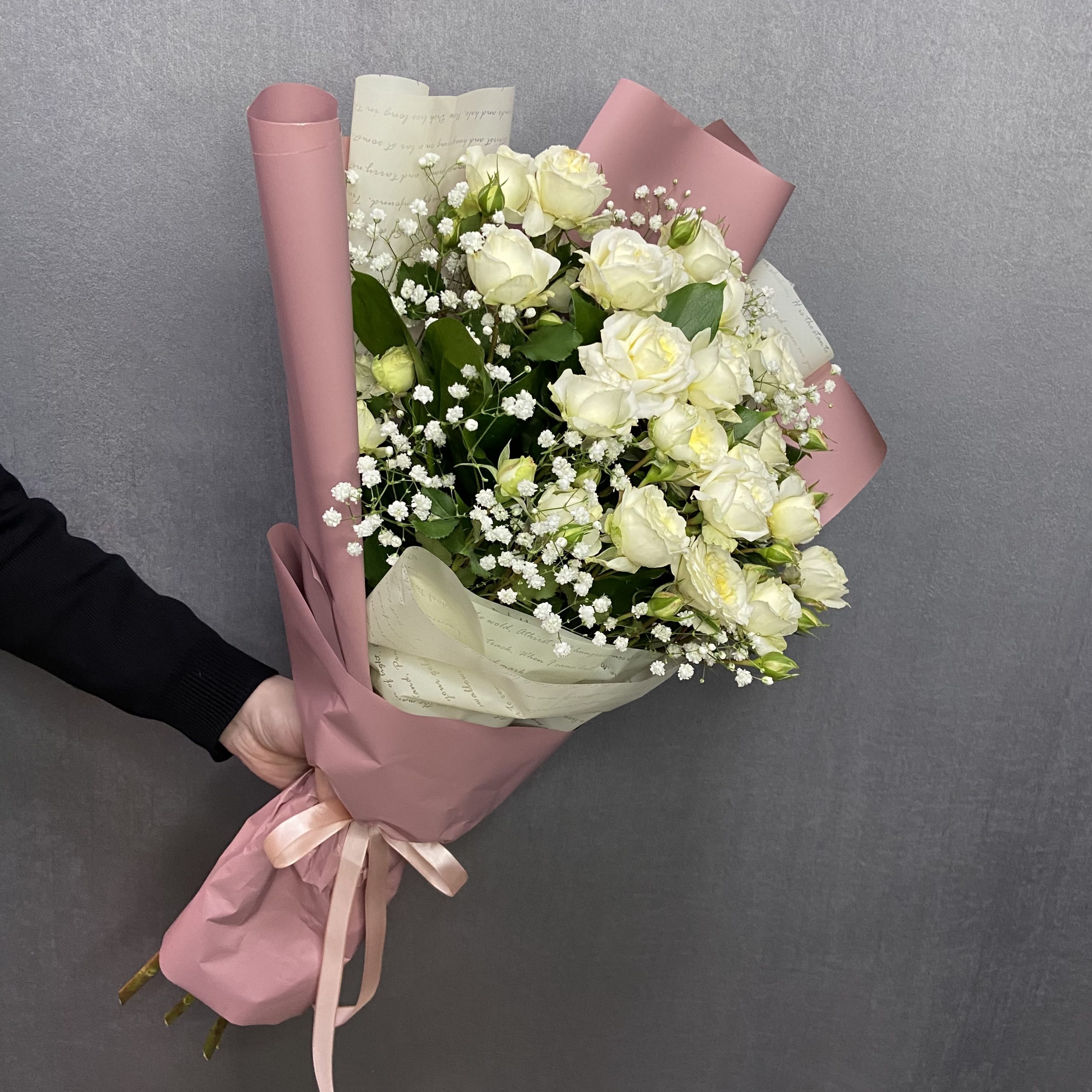 Состав: роза кустовая — 5,гипсофила — 1,тропический микс — 1,матовая пленка — 3,лента атласная — 1