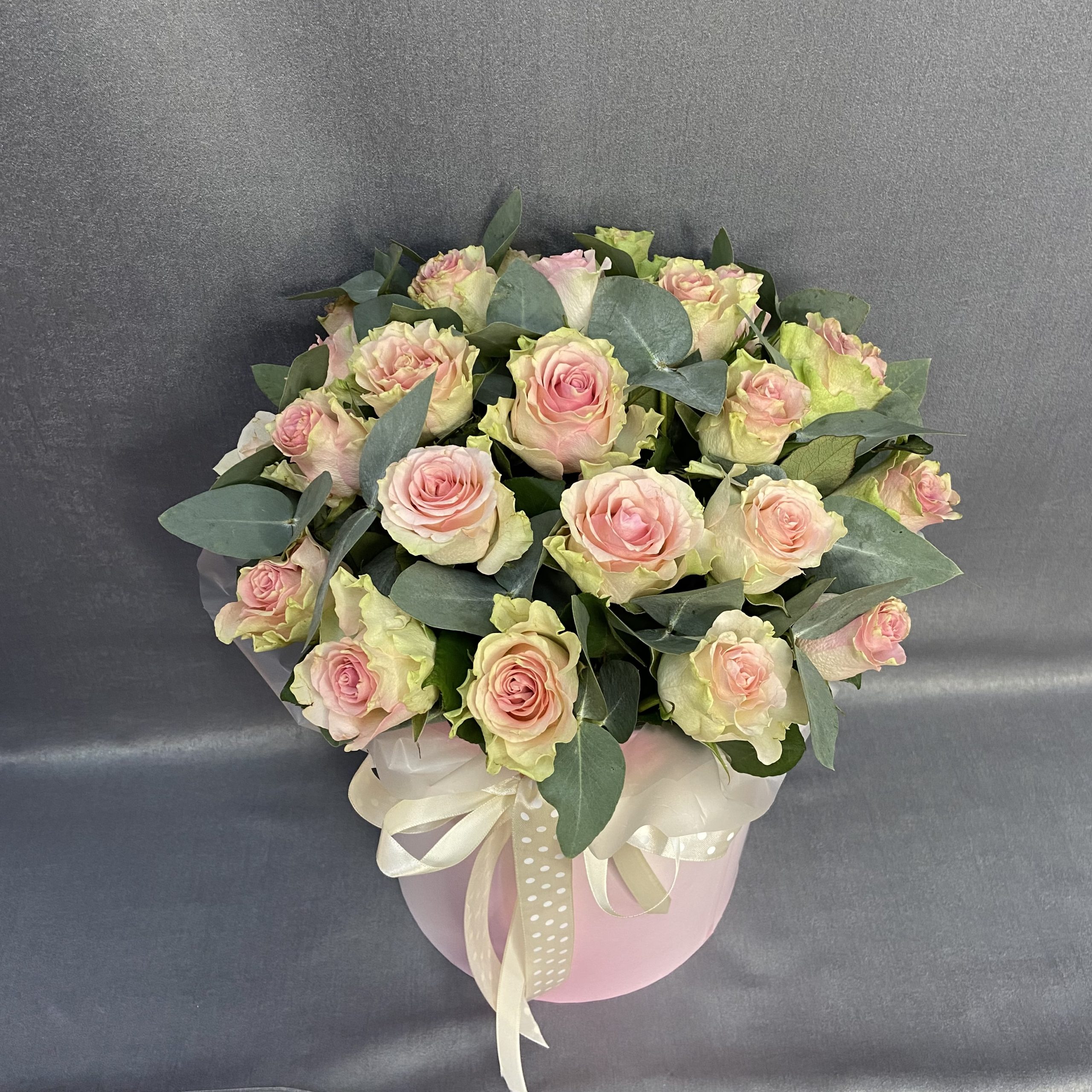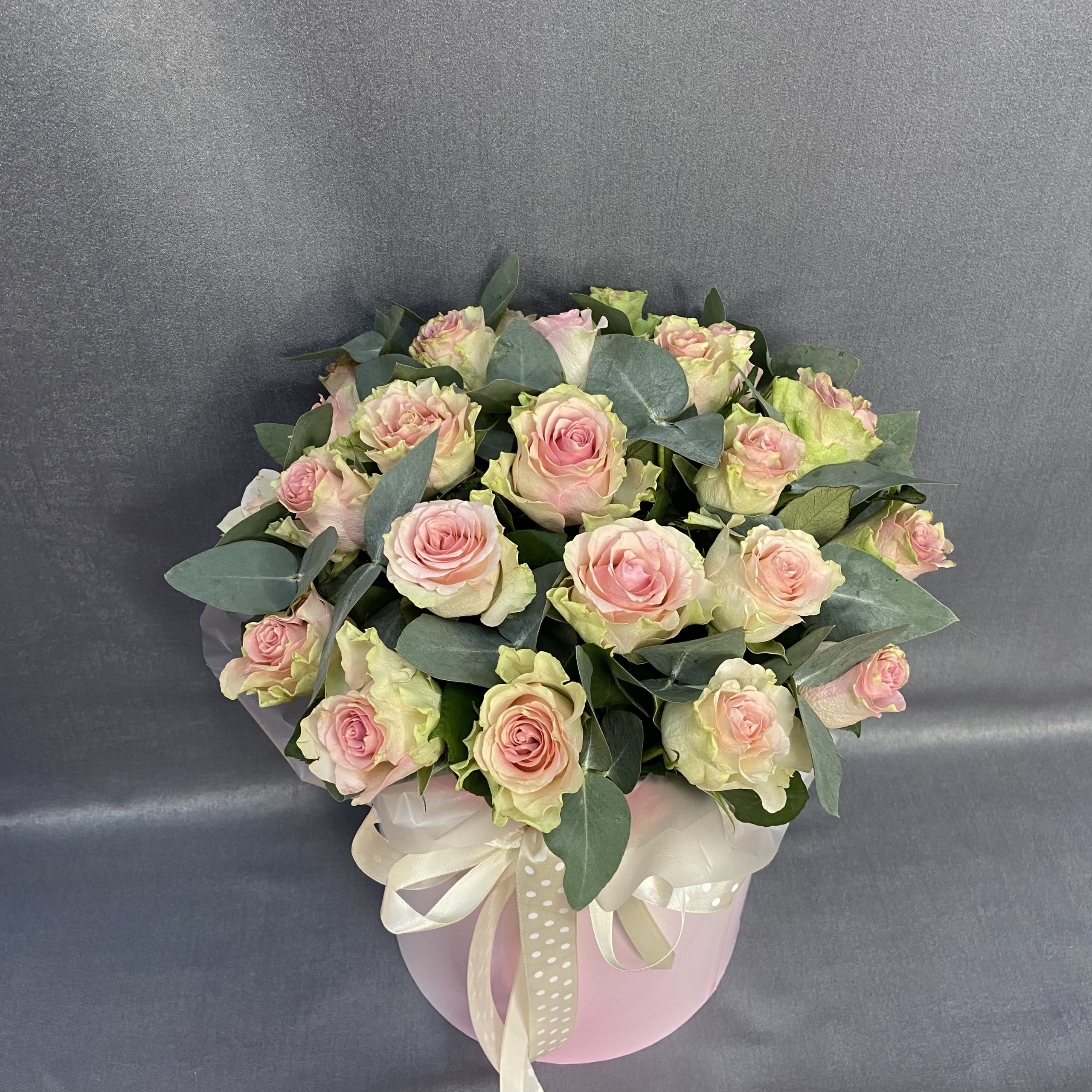 Состав: Роза 50 — 25,оазис — 2,шляпная коробка цилиндр — 1,лента атласная — 1