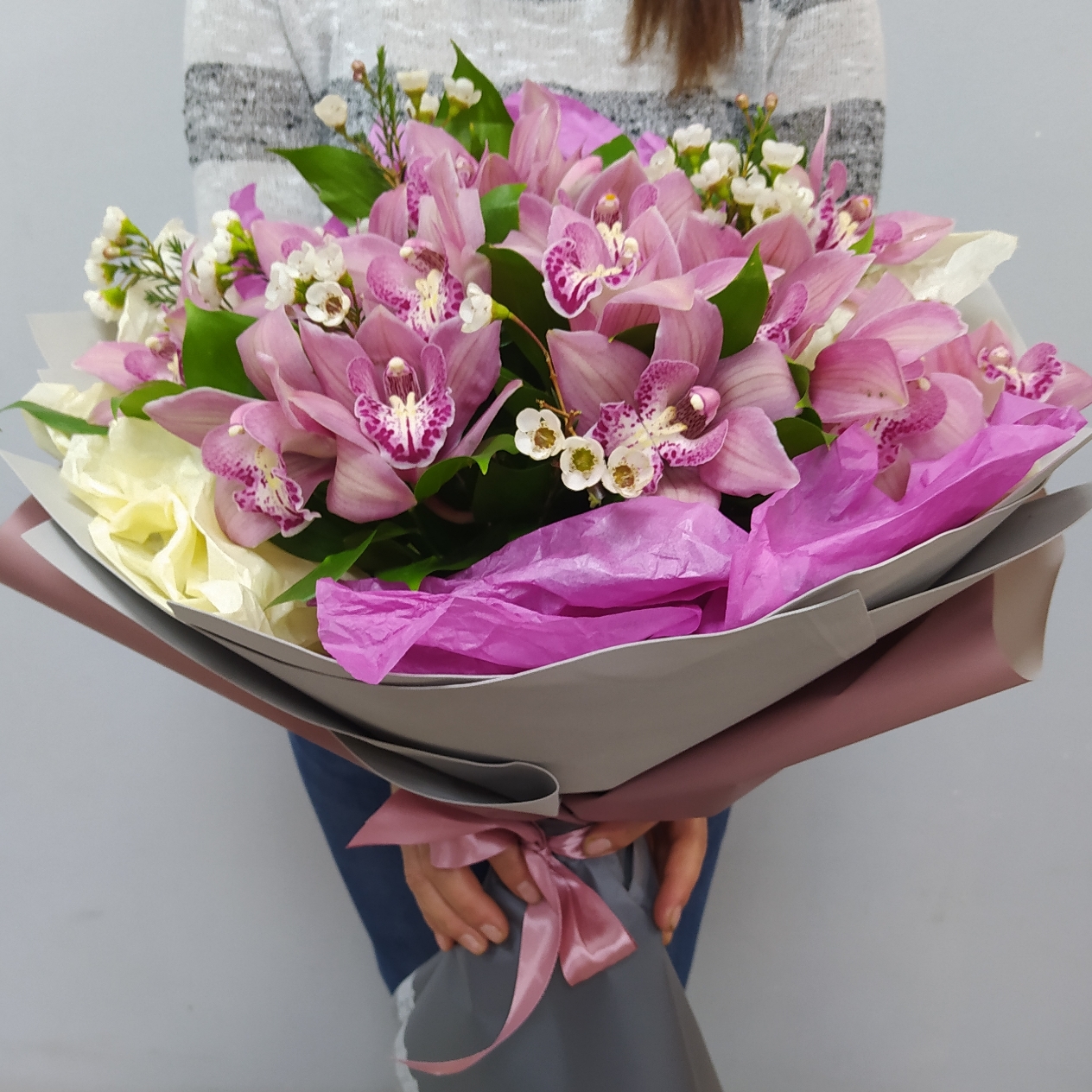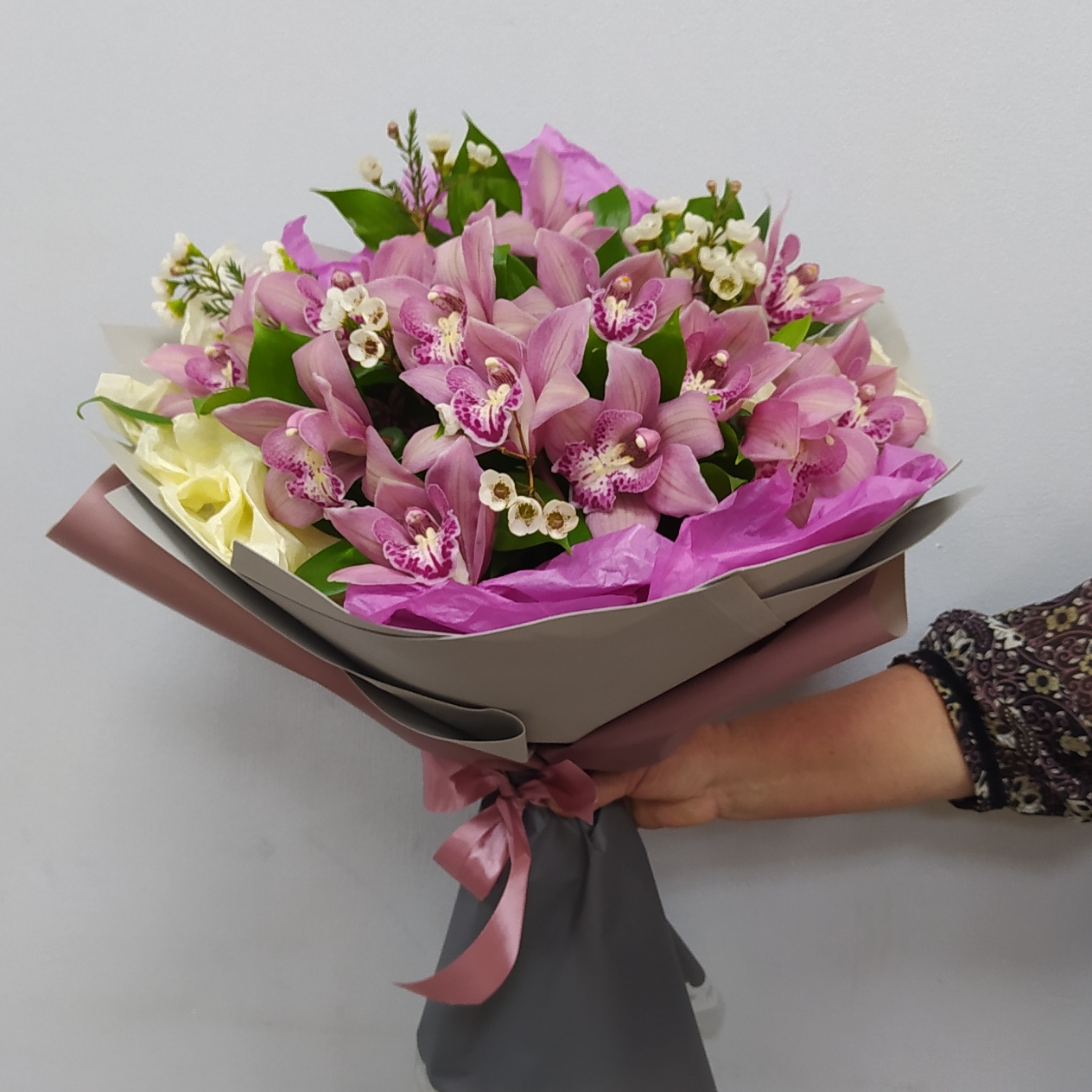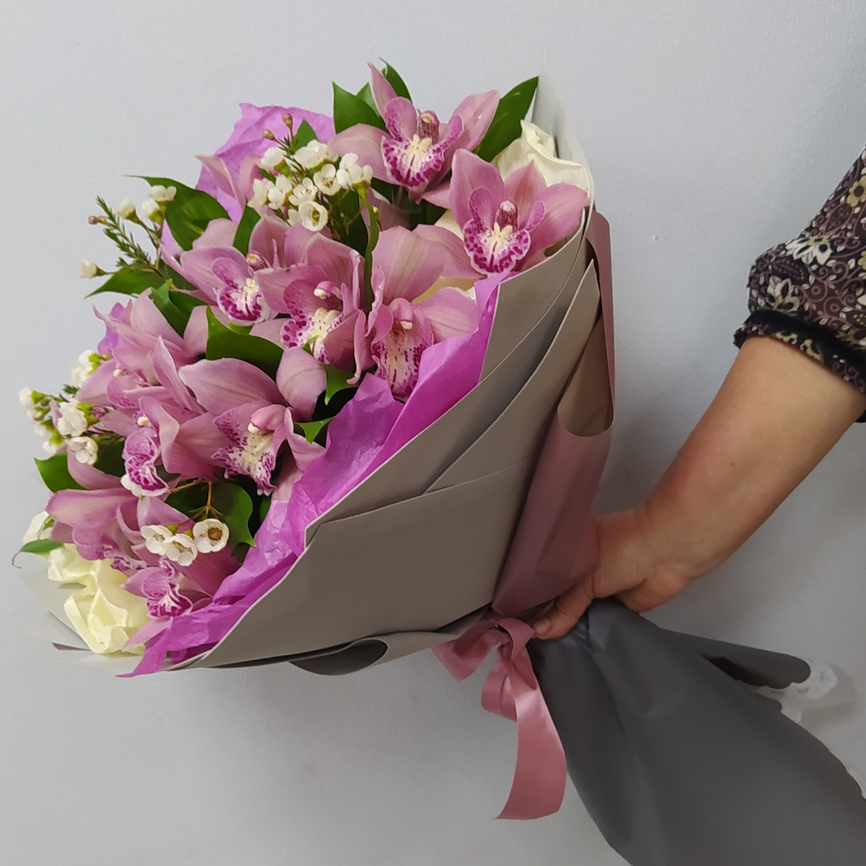 Упаковка: — фоамиран, Матовая плёнка, Атласная лента.